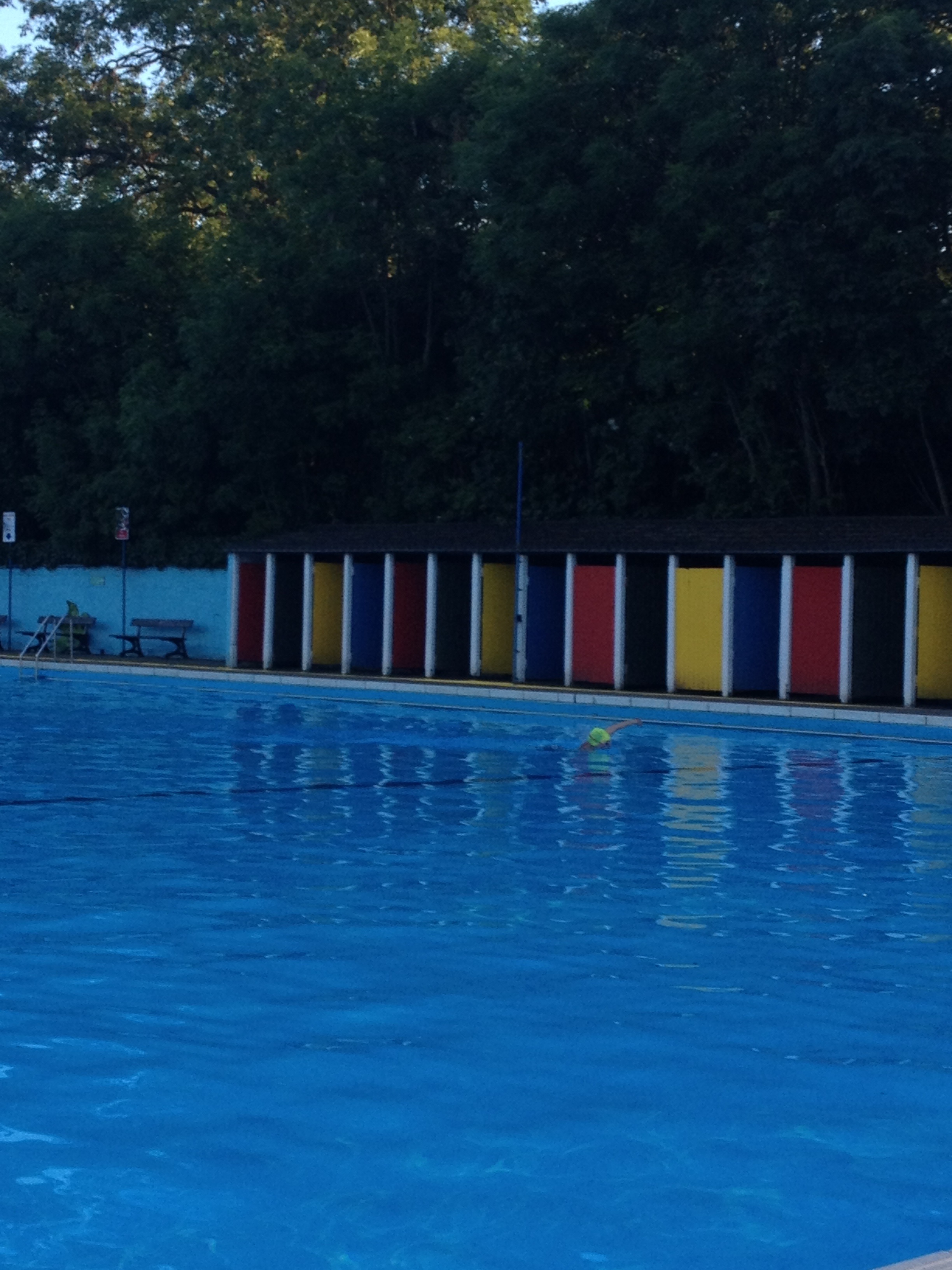 Then comes the public, who are foolishly optimistic about the temperature. A hot June day results in crowds, who often don’t realise that a 25 air temperature doesn’t mean equal water temperature. The below was Katie (spot her if you can) swimming in the lido all on her own on a glorious sunny evening, whilst me and Brian shivered (water temperature was only 14) on the side lines and drank tea (actually B only drinks hot Ribena) and listened to 3 regulars playing guitars and singing. Glorious.