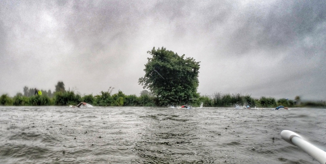The first section was also notable for the worst weather of the day. A very heavy shower lasted about 10 minutes, and cut visibility in the water dramatically. At this point I was glad I decided to wear clear goggles instead of tinted, as otherwise I don’t think I could have seen where I was going! As swimmers, we didn’t mind the rain so much, but we could see spectators on the river bank who must have gotten very wet in that shower 🙂