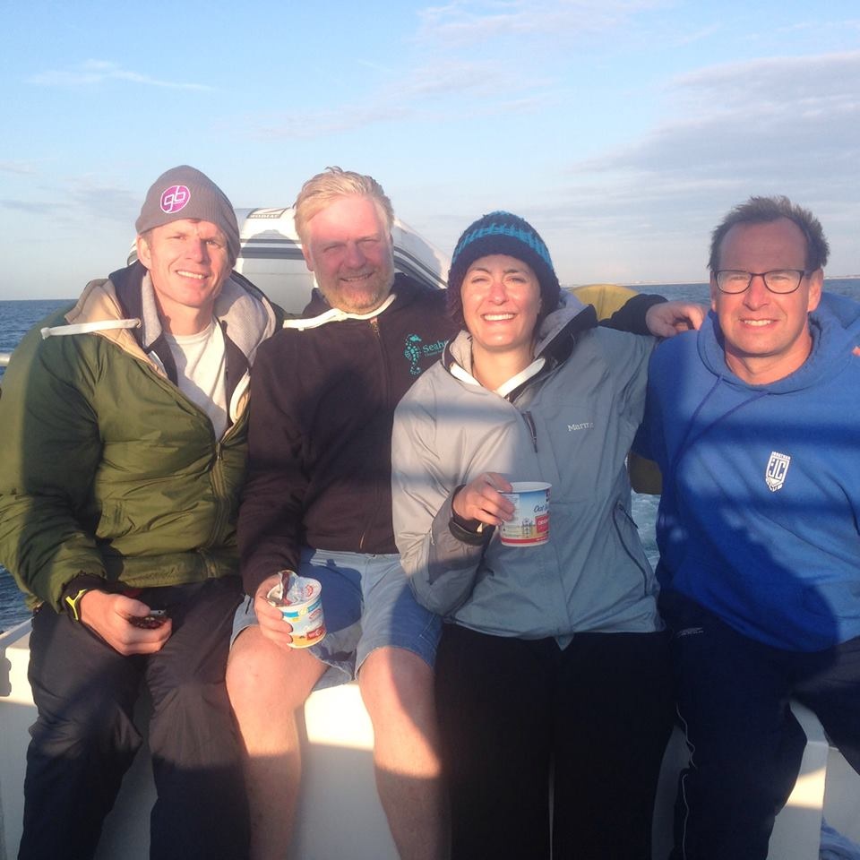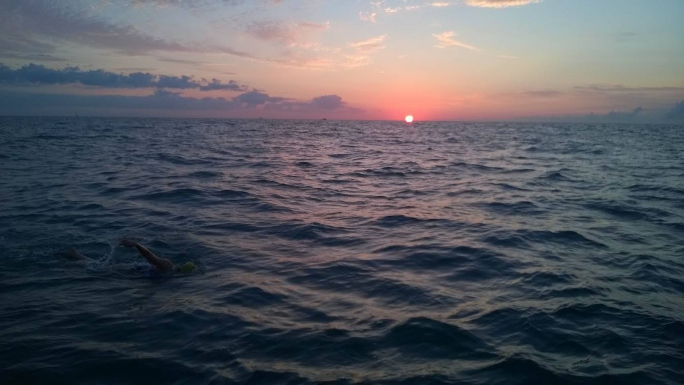 I was worried that it was going to be freezing when I jumped off the back of the boat, but it felt surprisingly warm (well done heat wave!). As I was swimming my hour leg, the sun came up with a beautiful sunrise, which made it a magical experience.