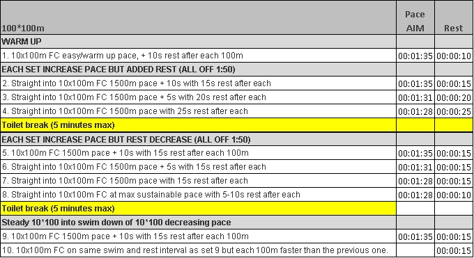 As it was March completing this in open water wasn’t an option so we went down to Crystal Palace and set about doing 100 x 100. We used a plan that was from H2open magazine site and then amended it for ourselves. It broke it down into 10 X 10 X 100 and varied each 10 based on effort/rest and additionally, we decided to alternate who would be leading every 10 x100.