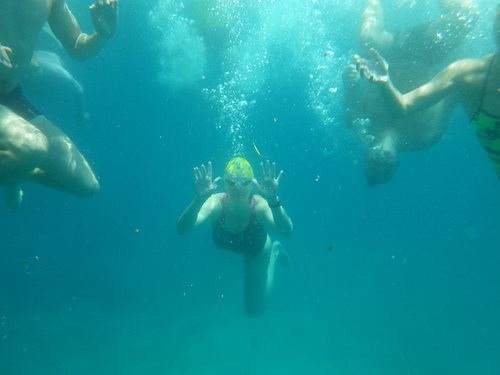 We were staying in a lovely hotel right near the harbour and that night we met our group over dinner. I know it is clichéd but it was our lovely group who made the holiday. We had the very sweet Pauline and Colin from London who we still bump into a couple of times a year at swims, the crazy Germans, Manfred and Klaus, with the questionable taste in speedos (blue tie-dye), KP an American living in Oman who could swim for miles and our fantastic guides Tina and Andy. Tina is from Cornwall and we met up with her again when we went down to the Festival of Sport. Andy was a super laid back Australian. After impressing on us the importance of being on time Andy habitually turned up 5 – 10 mins late. We called this ‘Andy time’.