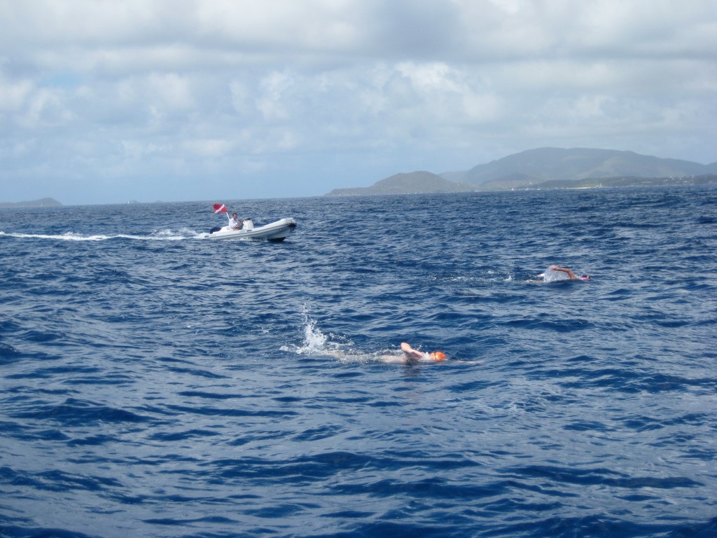 There were 14 of us on the trip, along with two guides (Lizzie and Simon). We averaged between 3 and 4 hours of swimming a day, swimming along a linear archipelago of islands. Each morning we would take the boat to the point where we stopped the previous evening, so there was a real sense of progression through the islands. Highlights included swimming past Necker Island (Richard Branson’s private island), and swimming the channel between the British and US virgin islands (but not being allowed to land on the beach as we didn’t have our passports with us).