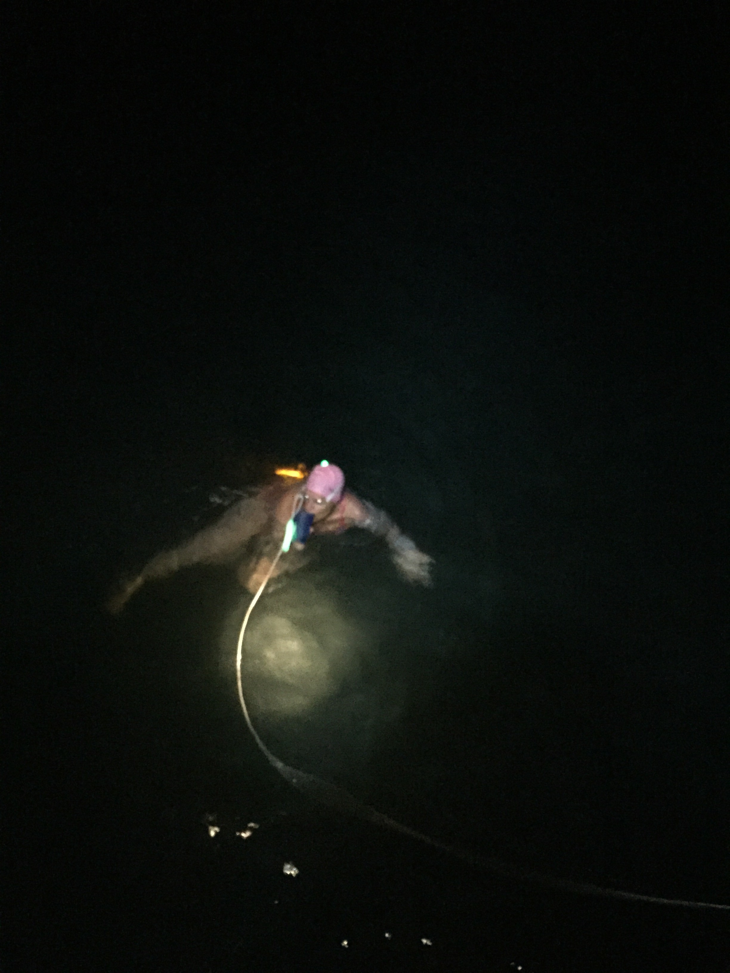 Lisa was going to feed every hour for the first 2 hours then drop to 30 minute feeds for the remainder. During the night swimming the main task was keeping Lisa well lit so the sense of swimming in the dark was hopefully reduced. This led to “torch arm”, which is similar to the claw for those “Friends” fans, and this and an inability to multitask led to us, ok just me, blinding Lisa a few of times. Sorry Lisa!