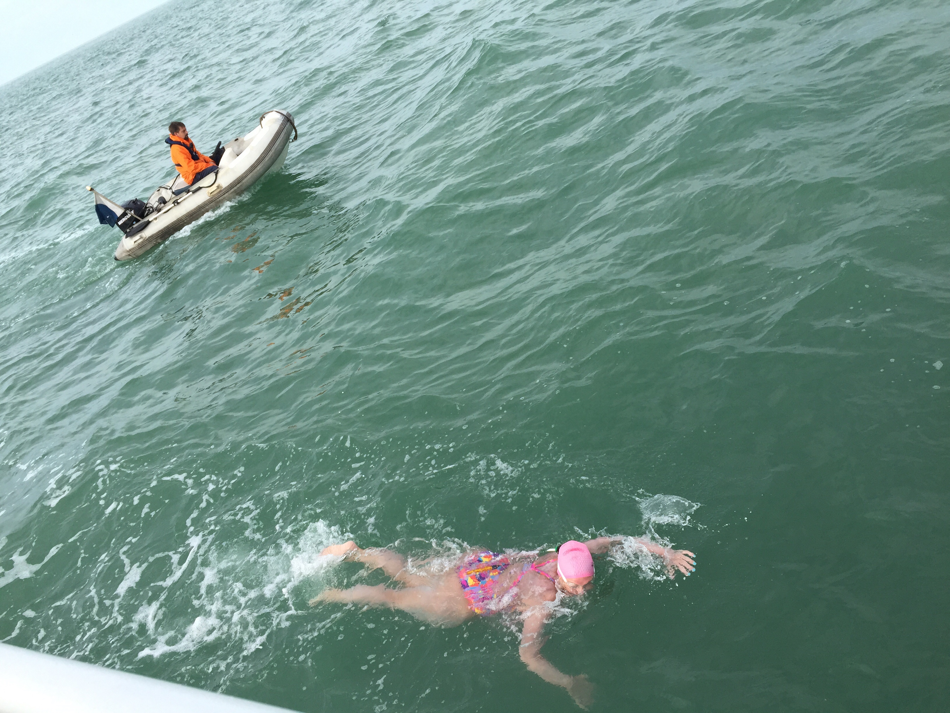 The sun finally rose and with it we settled into a routine. With the sunshine also came the wake up of all the supporters and soon messages of support were coming in thick and fast via social media. We were writing some on a white board and hanging them over the side for Lisa. As the day went on the hardest part was knowing what type of message to write her. She was obviously getting fatigued rapidly and therefore, things that she might normally find funny might just p!ss her off at this point, so trying to find a suitable message plus fit in on to a white board was a challenge. A couple that got a chuckle out of her were “Swim backstroke, it’s easier. Love Nico”. Nico is Lisa’s nephew and the pure innocence of this message was a guaranteed smile. “Go Go Lisa, from the WHOLE of facebook” – evidently I was a bit overwhelmed by social media at this point!. At one point we also decided to write a message from the DCosta family. Elaine DCosta was Lisa’s friend who passed away and the reason why she was raising money for the Royal Marsden. It was tricky to decide when to show this message as we wanted it to give her a boost but at the same time we risked overwhelming her with emotion when she should just be concentrating on swimming. As it turns out it did make her cry (not ideal with goggles on) but I think it was positive knowing how much they appreciated what she was doing.